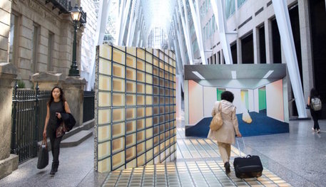 These spaces we are so familiar with – the Galleria and generic office spaces – are reintroduced in a way that redirects the human flow while heightening our awareness of the everyday sites we absent-mindedly shuffle through.